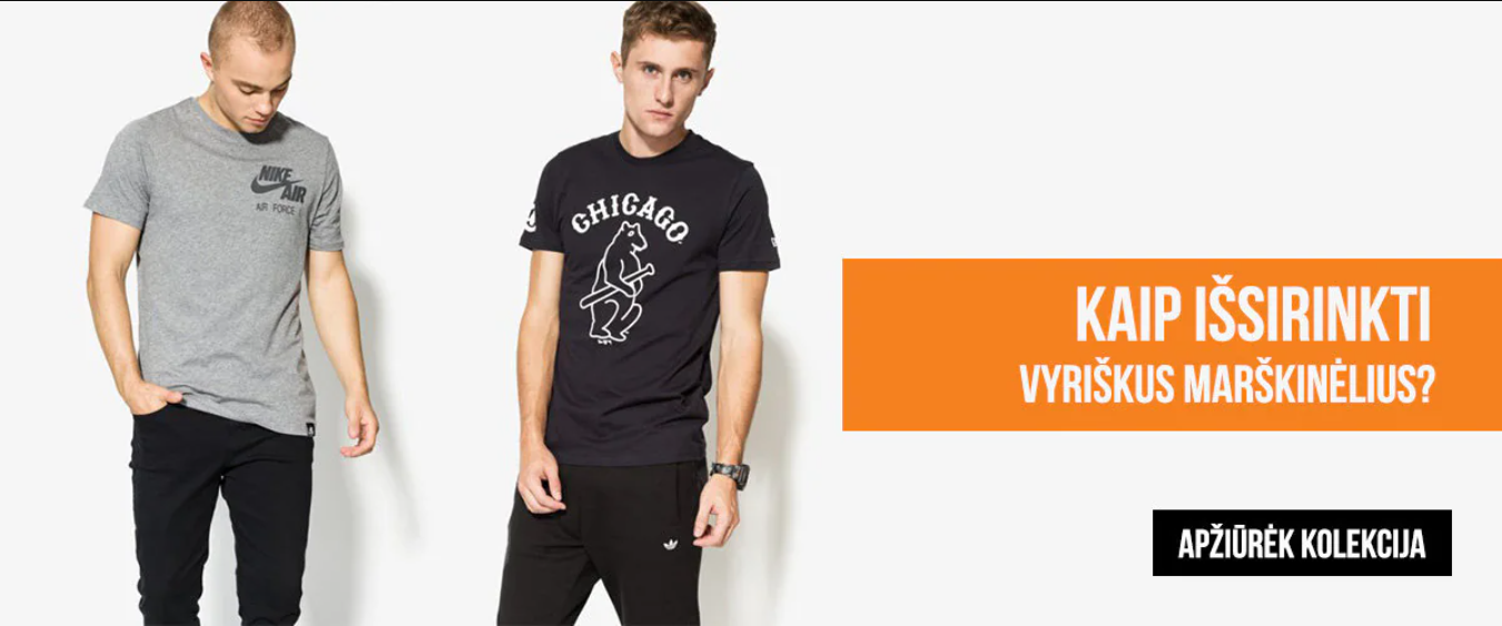 Marškinėliai tai vyriško garderobo pagrindas. Jie yra patogūs, universalūs, o parduotuvių kabyklose ir lentynose jų tiesiog apstu. Lengvai rasi marškinėlius, kurie pabrėš Tavo individualų stilių. Būtent jie dažnai parodo asmens charakteri, pabrėžia stilių ir asmenybę. Dar vienas marškinėlių bruožas, prisidedantis prie jų populiarumo, yra jų patraukli kaina. Tai nėra brangi garderobo dalis – net firminius Nike, adidas, Puma ar Umbro marškinėlius galima įsigyti vos už kelis eurus.